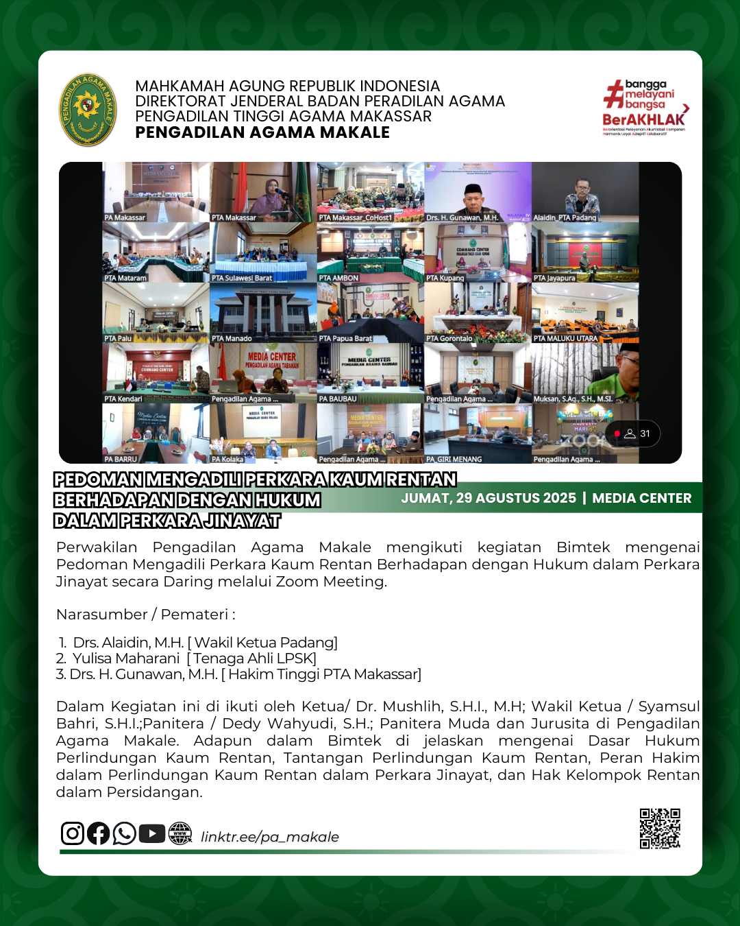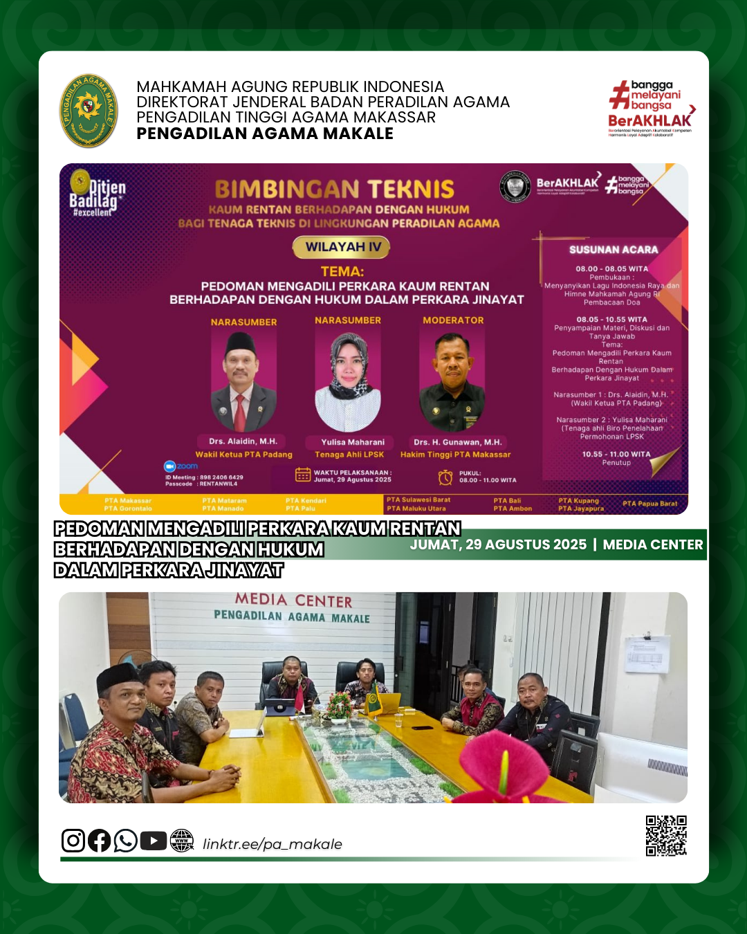 Written by Super User on 29 August 2025. Hits: 385 BIMBINGAN TEKNIS "PEDOMAN MENGADILI PERKARA KAUM RENTAN BERHADAPAN DENGAN HUKUM DALAM PERKARA Jinayat" Add comment Name (required) E-mail (required, but will not display) Title (required) Notify me of follow-up comments Refresh Send Cancel